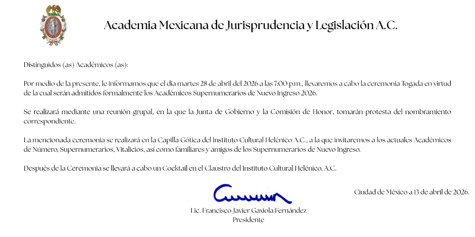 La Academia Mexicana de Jurisprudencia y Legislación, A.C. Se complace en invitar a usted a la ceremonia solemne (Togada) que tendrá lugar el próximo martes 20 de mayo de 2025, a las 19:00 horas, en la Capilla Gótica del Instituto Cultural Helénico (Av. Revolución 1500, Col. Guadalupe Inn, Alcaldía Álvaro Obregón, Ciudad de México), en donde el Académico de Número Sitial 11, Don Alfonso Pérez-Cuellar Martínez, pronunciará su discurso de ingreso: "Las Ficciones en el Derecho: Entre la Justicia y la Manipulación", que será contestado por el Académico de Número Sitial 46, Don Ricardo Alfredo Sodi Cuéllar.